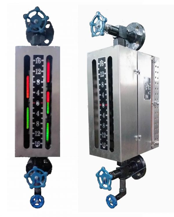 由红、绿两套独立的发光带发出的光,经过滤光镜射向水位计本体内腔。在腔内汽相区域,绿色斜射到腔体壁上被吸收;红光直射到正前方,两排窗口在无水状态同时显示红色。在腔内液相区域,由于红光经过水的折射,将红光斜射到壁上,而绿光经过水的折射,正好折射到正前方,两排窗口在有水状态同时显示绿色,因此在正前方任一点观察两排窗口同时显示汽红、水绿。